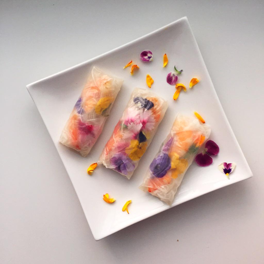 Snack time! These are Vietnamese rice paper rolls with shrimp and edible flowers